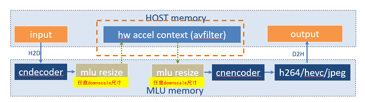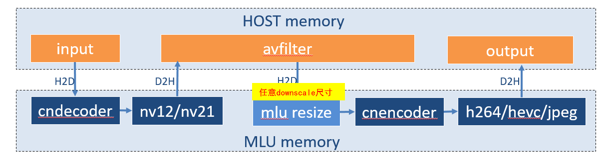 使用硬件解码器与编码器,在解码器与编码器之间,直接连接一个scale resize 算子,算子作为独立的filter模块,算子直接输出到目标尺寸,然后直接做编码操作。